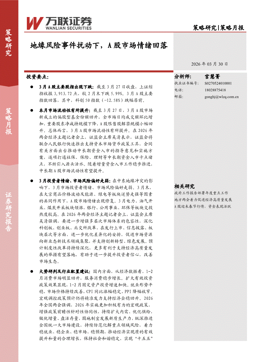 万联证券-策略月报:地缘风险事件扰动下,A股市场情绪回落-260330