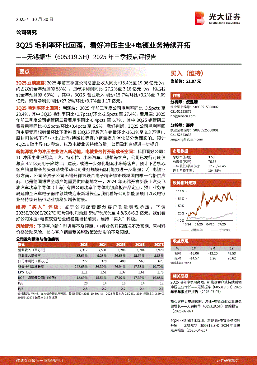 无锡振华:光大证券-无锡振华-605319-2025年三季报点评报告:3Q25毛利率环比回落,看好冲压主业+电镀业务持续开拓-251030
