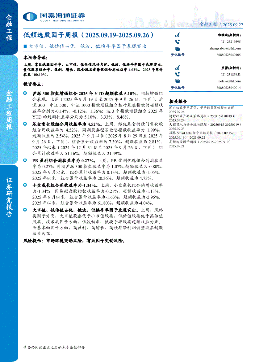 国泰海通证券-低频选股因子周报:大市值、低估值占优,低波、低换手率因子表现突出-250927