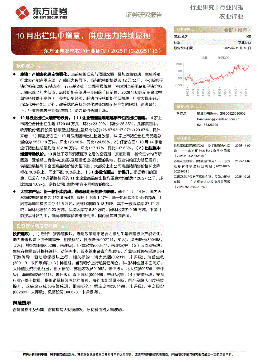 农林牧渔行业:东方证券-农林牧渔行业周报:10月出栏集中增量,供应压力持续显现-251115