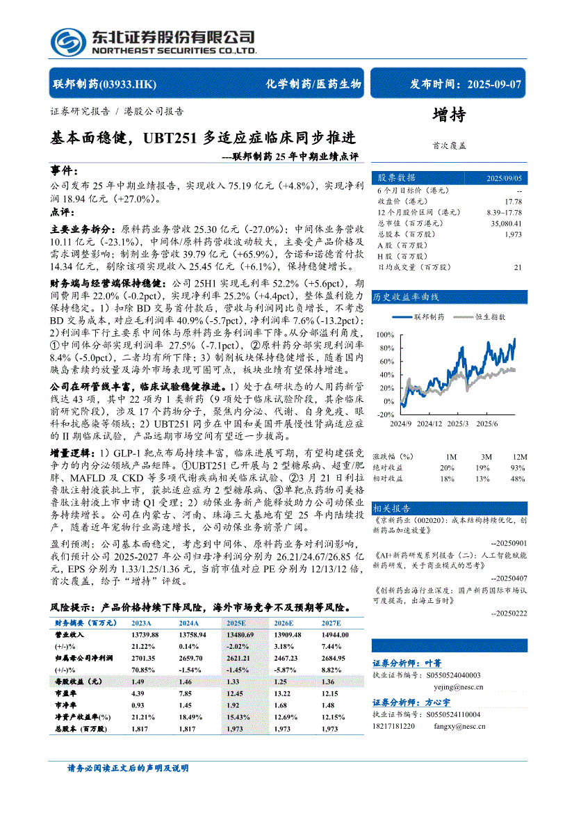 联邦制药:东北证券-联邦制药-3933.HK-25年中期业绩点评:基本面稳健,UBT251多适应症临床同步推进-250907