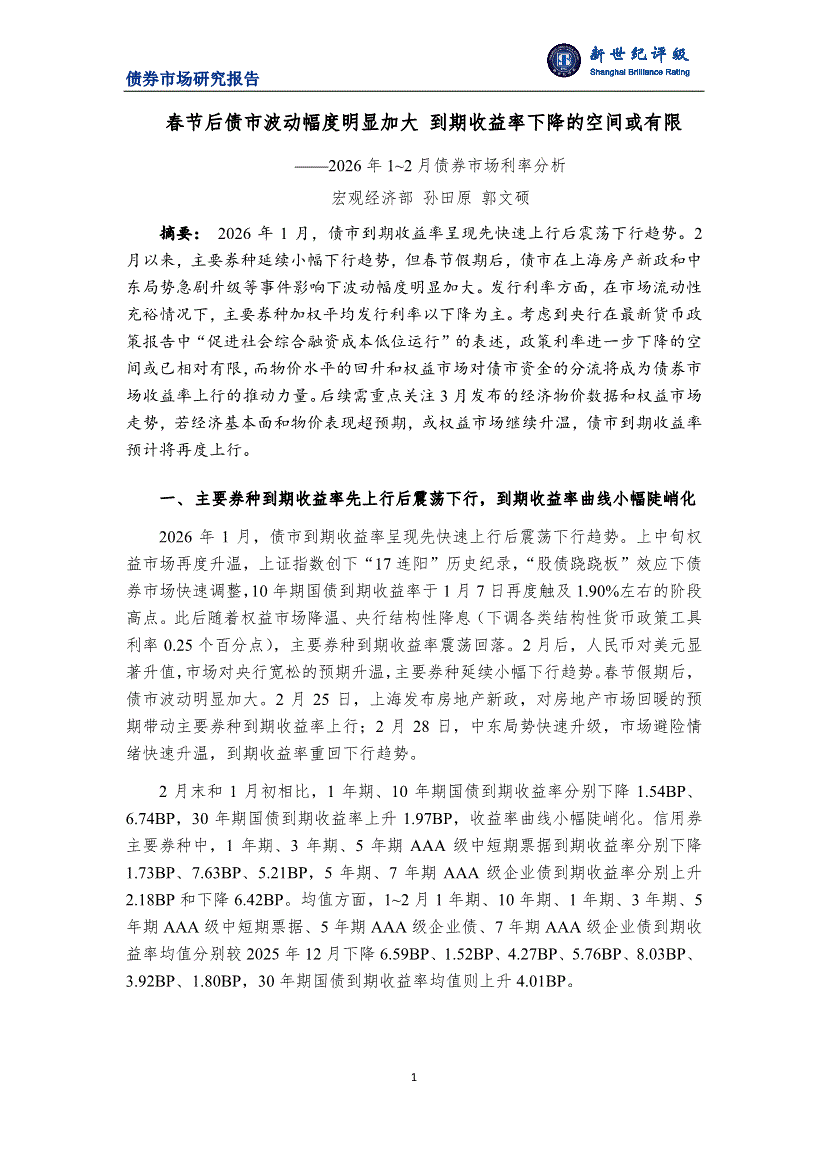 新世纪评级-2026年1~2月债券市场利率分析:春节后债市波动幅度明显加大,到期收益率下降的空间或有限-260325