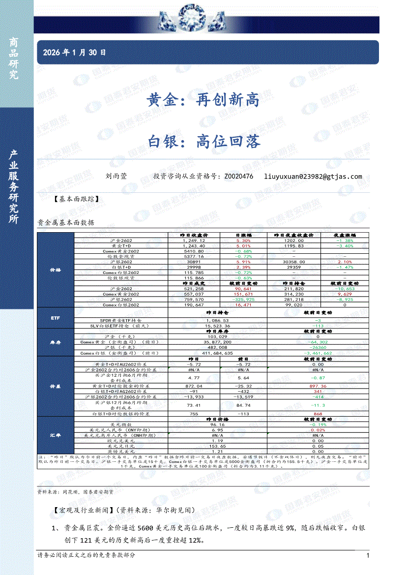 国泰君安期货-黄金:再创新高,白银,高位回落-260130