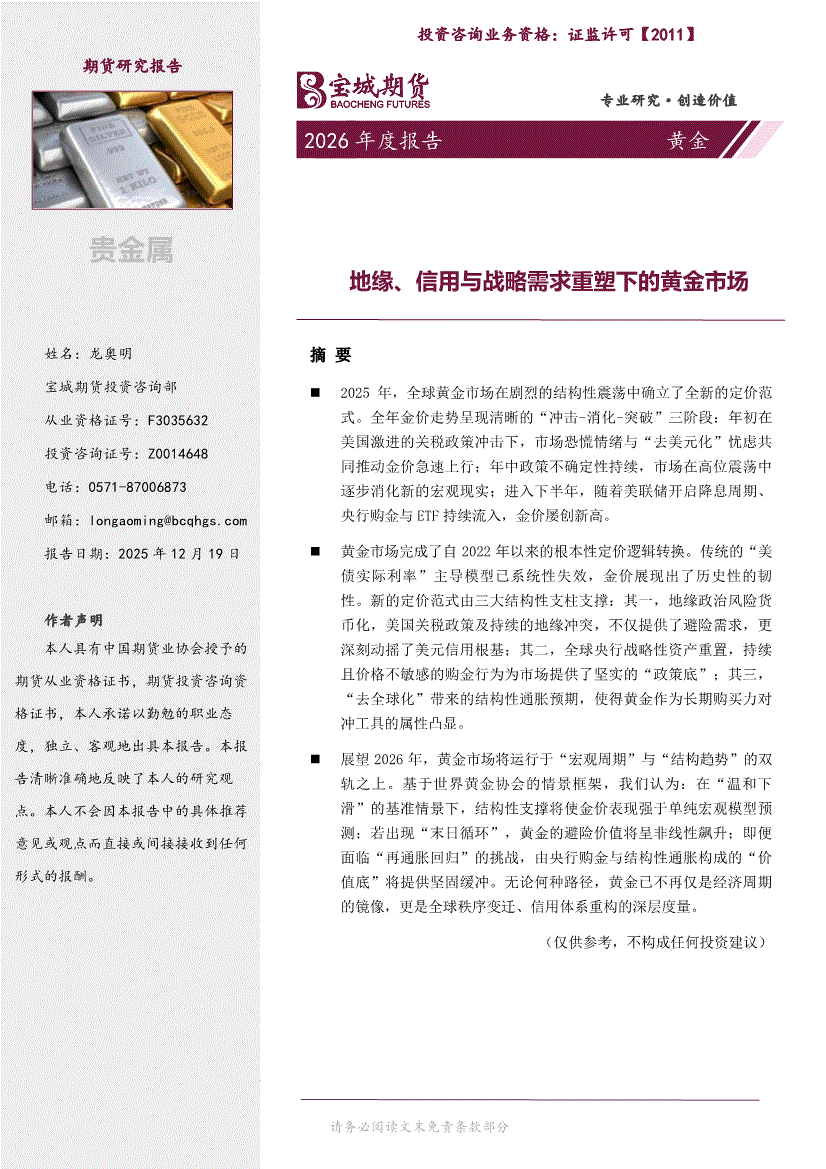 宝城期货-黄金2026年度报告:地缘、信用与战略需求重塑下的黄金市场-251219