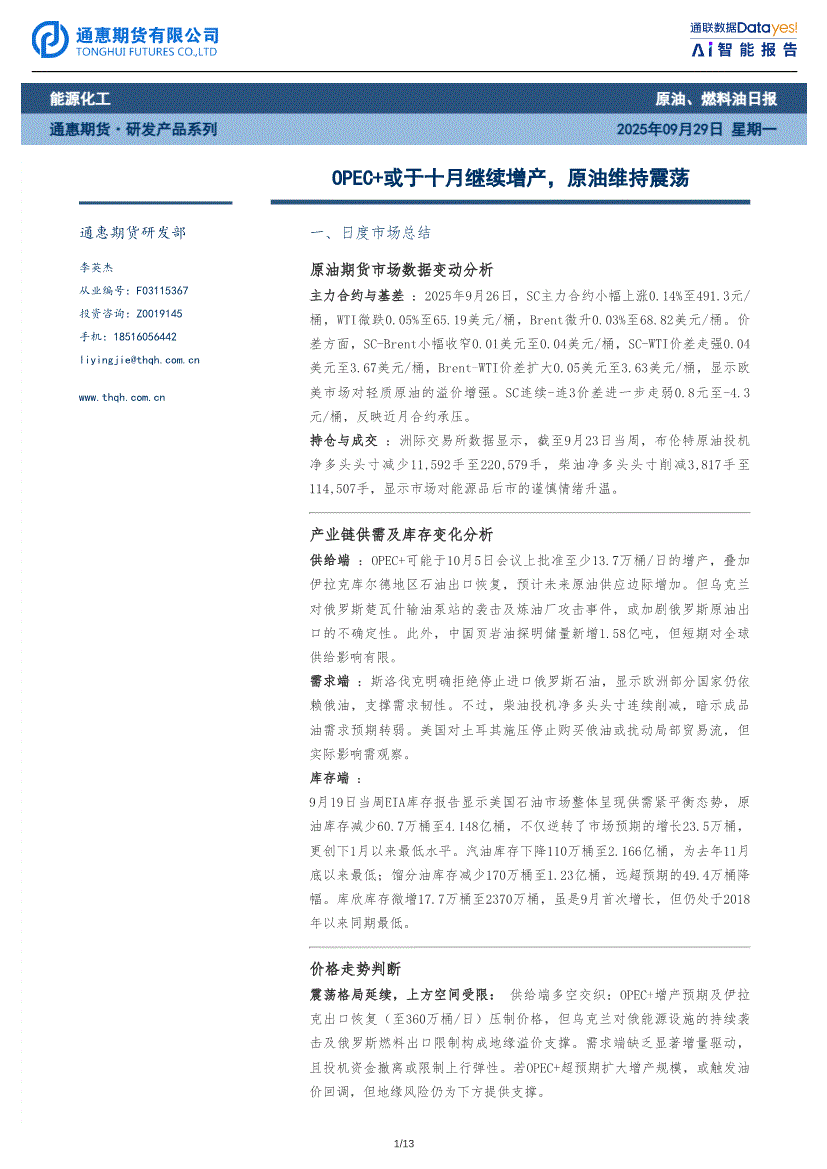 通惠期货-原油、燃料油日报:OPEC+或于十月继续增产,原油维持震荡-250929