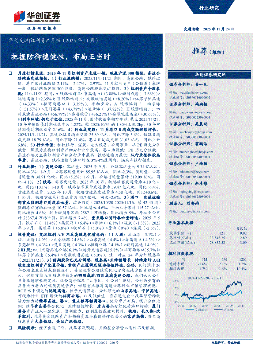 交通运输行业:华创证券-交通运输行业交运|红利资产月报(2025年11月):把握防御稳健性,布局正当时-251124