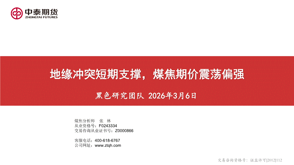 中泰期货-地缘冲突短期支撑,煤焦期价震荡偏强-260306