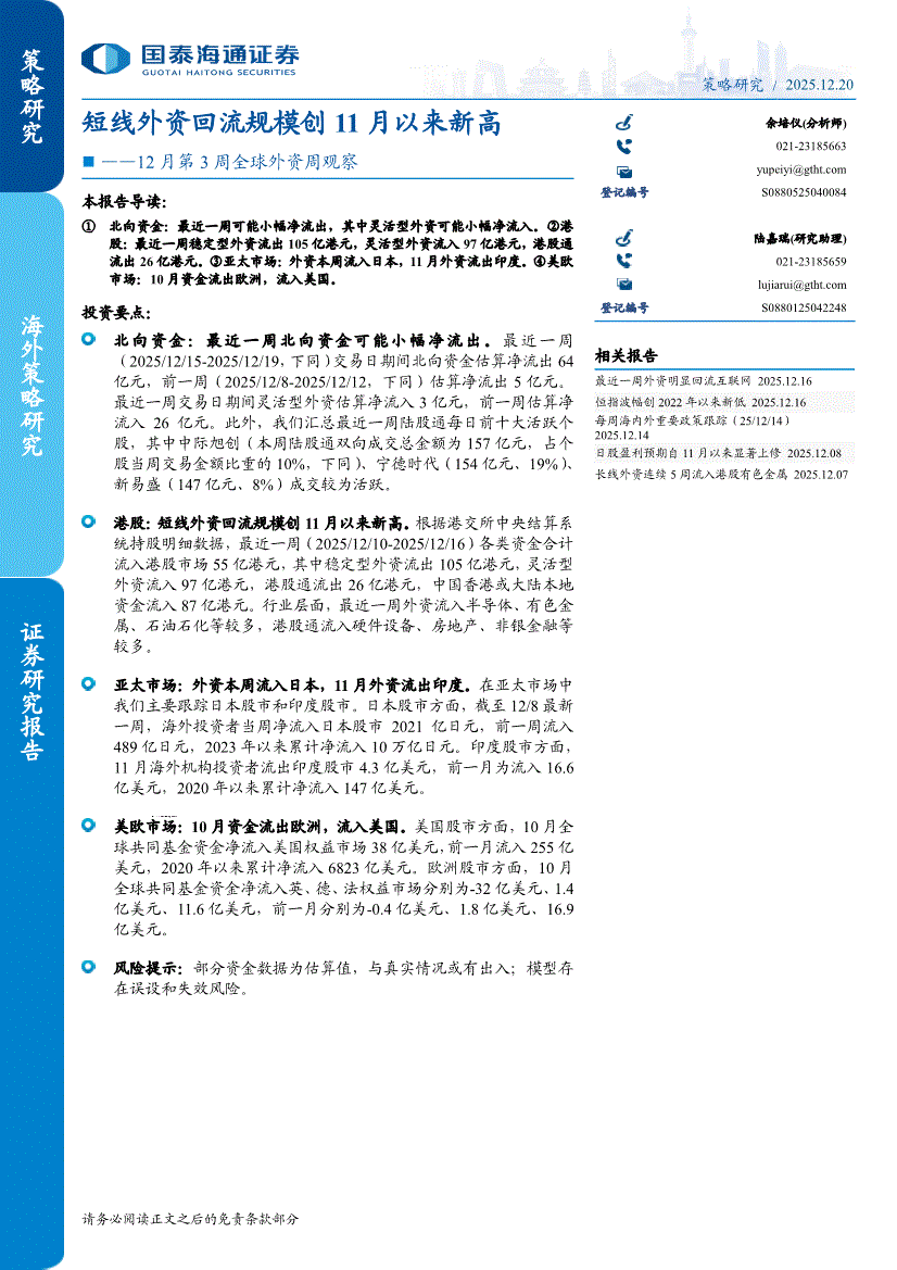 国泰海通证券-12月第3周全球外资周观察:短线外资回流规模创11月以来新高-251220