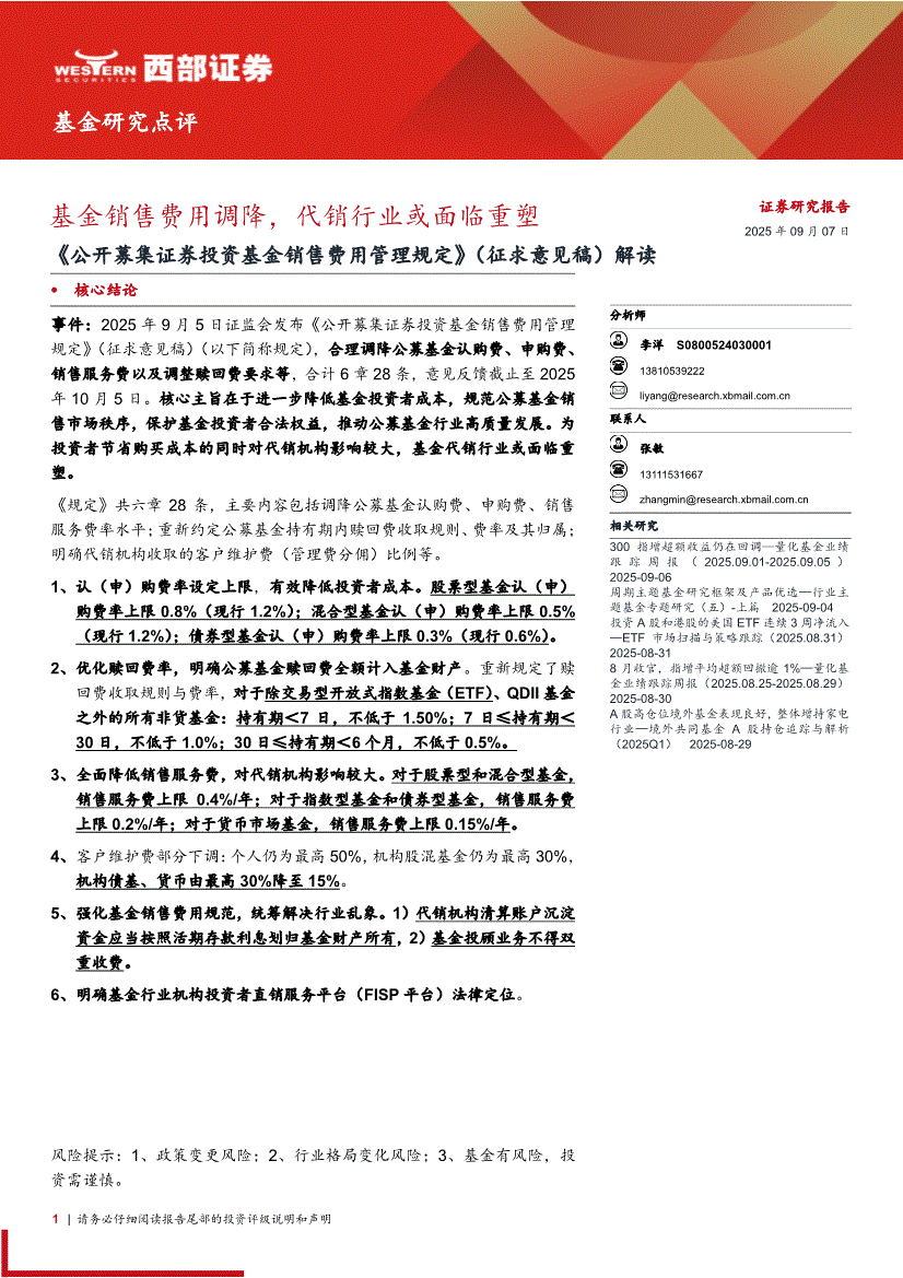西部证券-《公开募集证券投资基金销售费用管理规定》(征求意见稿)解读:基金销售费用调降,代销行业或面临重塑-250907