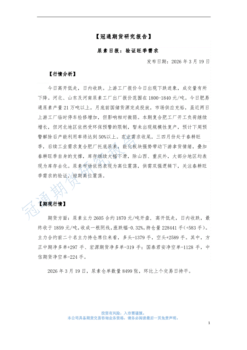 冠通期货-尿素日报:验证旺季需求-260319