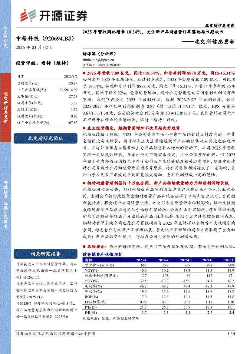 中裕科技:开源证券-中裕科技-920694-北交所信息更新:2025年营收同比增长18.34%,关注新产品耐磨管订单落地与长期成长-260302