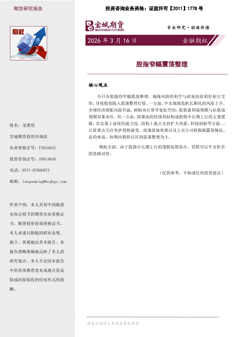 宝城期货-金融期权日报:股指窄幅震荡整理-260316