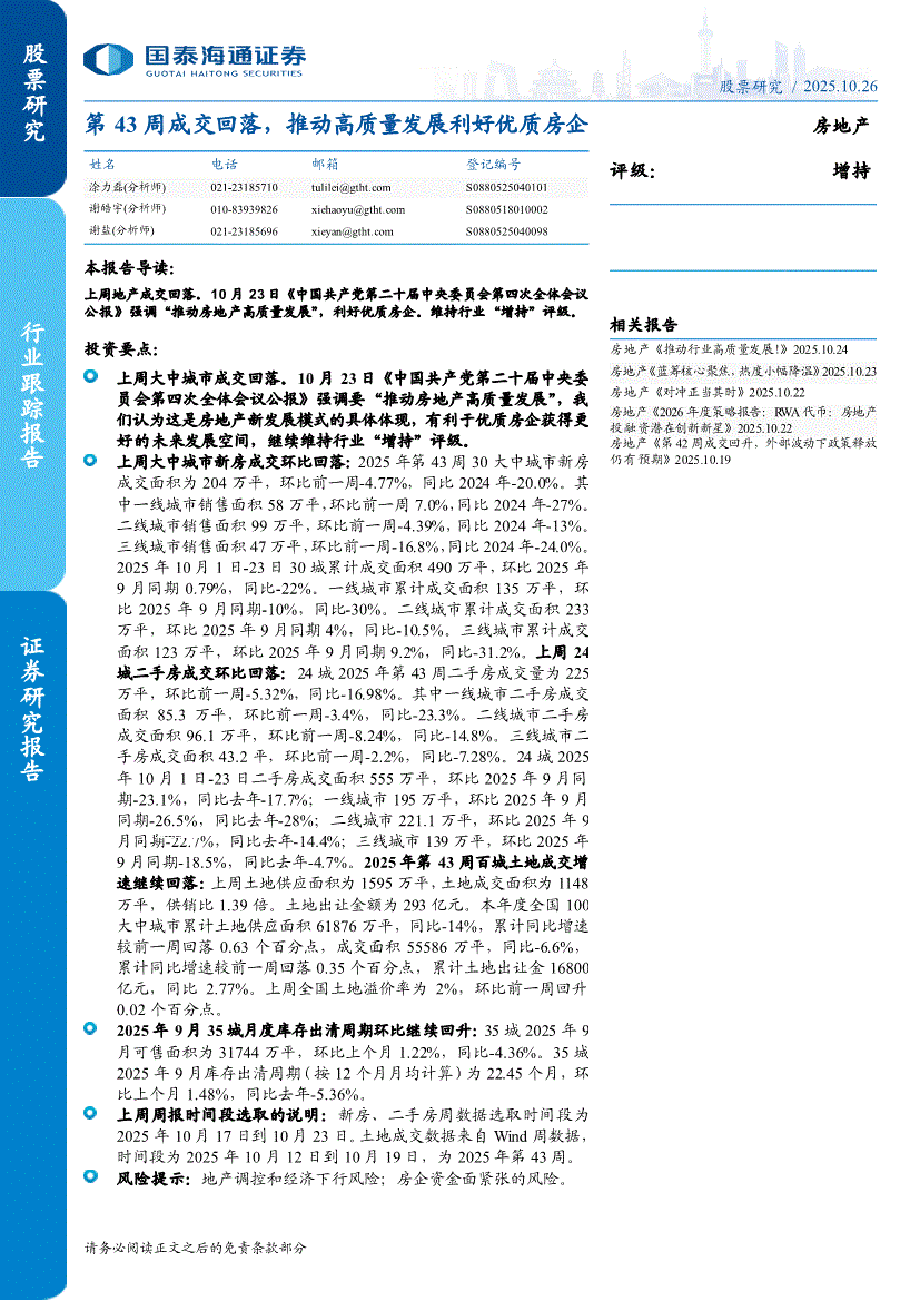 房地产行业:国泰海通证券-房地产行业:第43周成交回落,推动高质量发展利好优质房企-251026