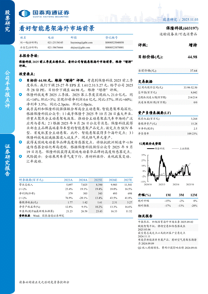 保隆科技:国泰海通证券-保隆科技-603197-看好智能悬架海外市场前景-251103