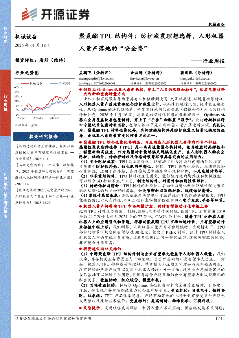 机械设备行业:开源证券-机械设备行业周报:聚氨酯TPU结构件,防护减震首选理想选择,人形机器人量产落地的“安全垫”-260118