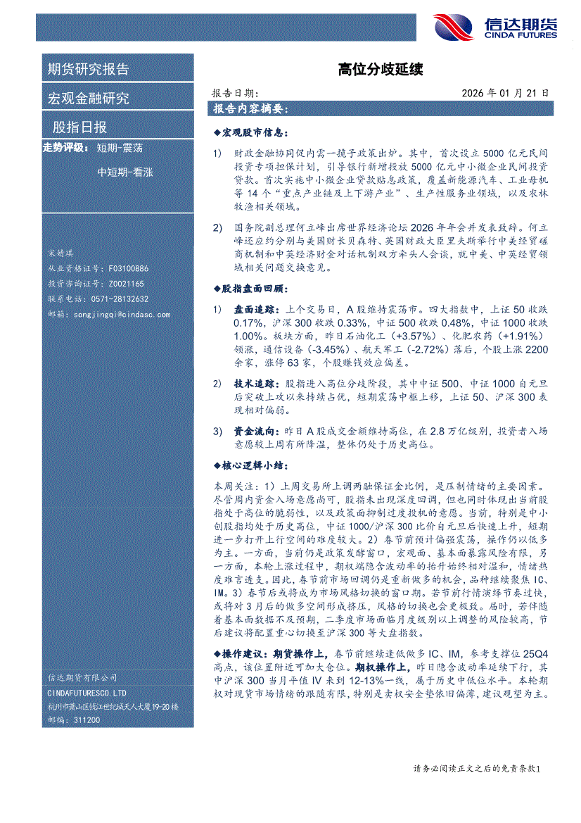 信达期货-股指日报:高位分歧展开,春节前预计偏强震荡-260120