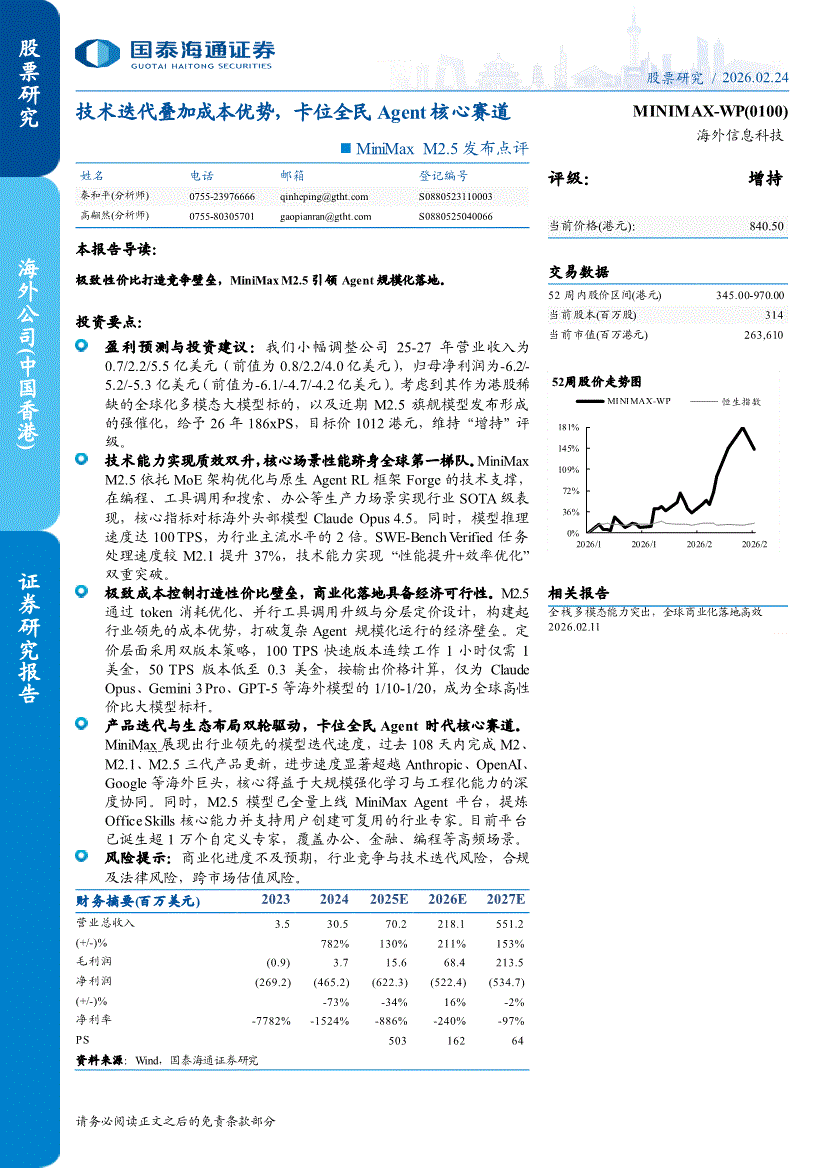 MINIMAX~WP:国泰海通证券-MINIMAX~WP-0100.HK-MiniMax M2.5发布点评:技术迭代叠加成本优势,卡位全民Agent核心赛道-260224