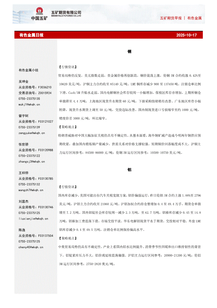 五矿期货-铜周报:中美经贸谈判变化左右市场情绪-251018