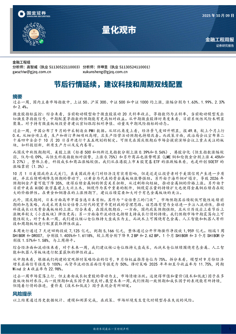 国金证券-量化观市:节后行情延续,建议科技和周期双线配置-251009