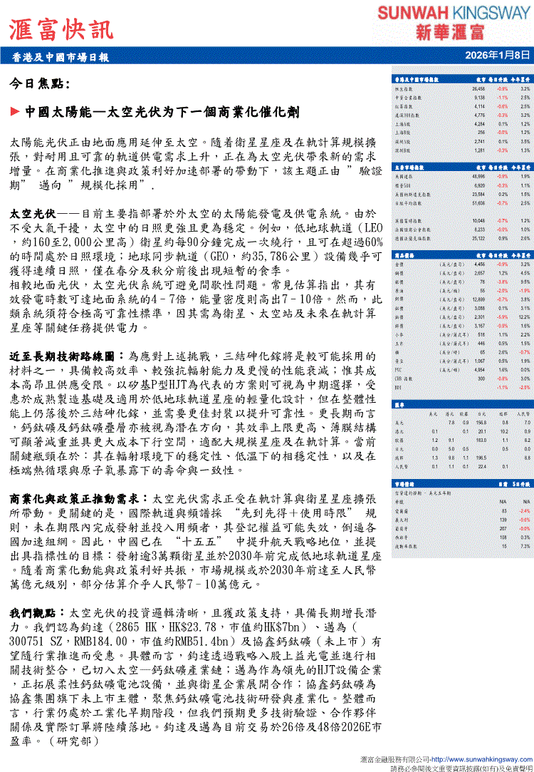 新华汇富-汇富快讯:香港及中國市場日報-260108