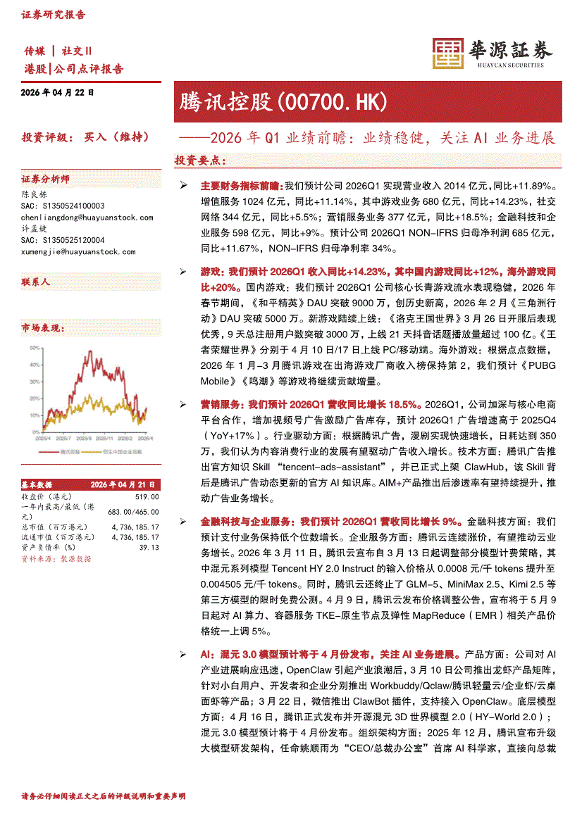 腾讯控股:华源证券-腾讯控股-0700.HK-2026年Q1业绩前瞻:业绩稳健,关注AI业务进展-260422