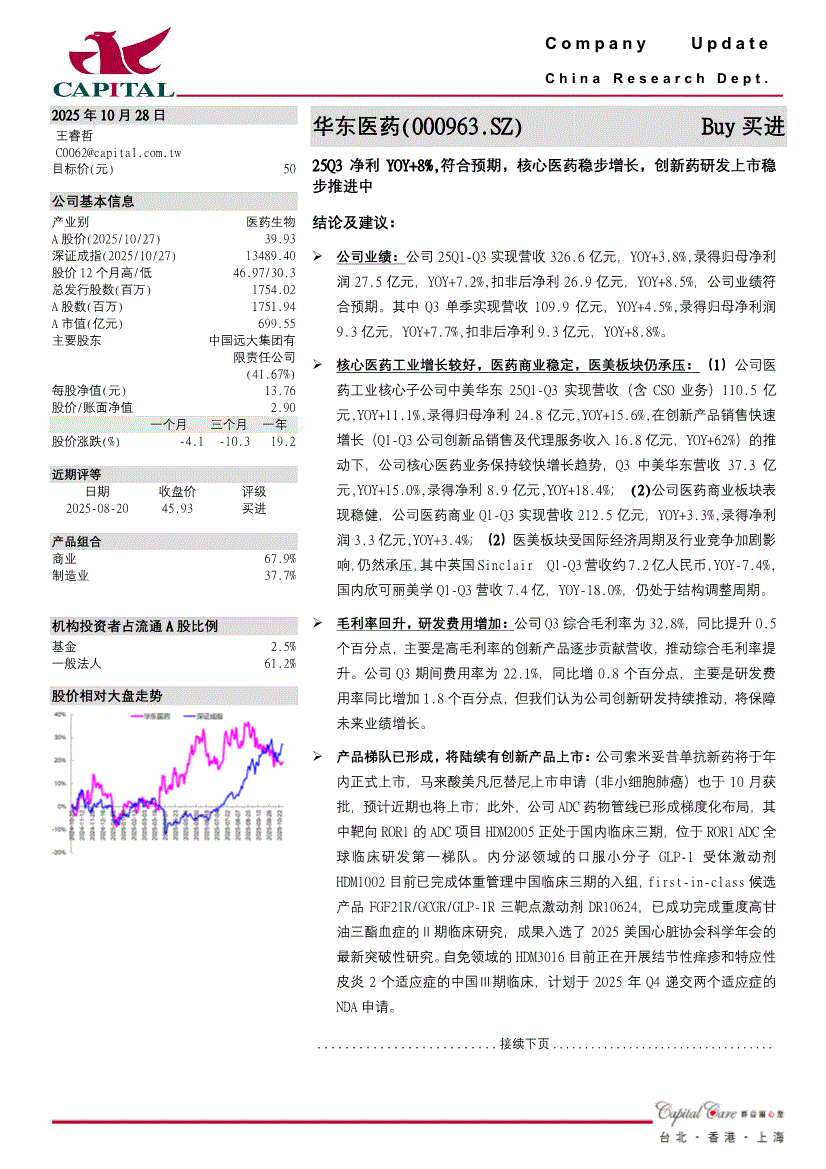 华东医药:群益证券-华东医药-000963-25Q3净利YOY+8%,符合预期,核心医药稳步增长,创新药研发上市稳步推进中-251028