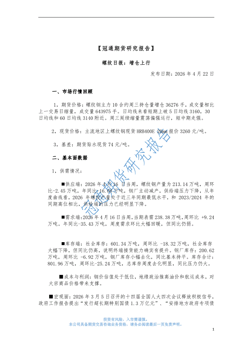 冠通期货-螺纹日报:增仓上行-260422