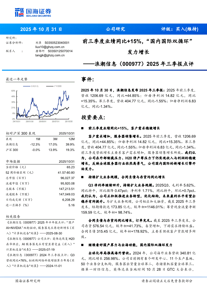 浪潮信息:国海证券-浪潮信息-000977-2025年三季报点评:前三季度业绩同比+15%,“国内国际双循环”发力增长-251031