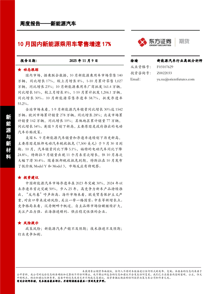 东证期货-10月国内新能源乘用车零售增速17%-251109