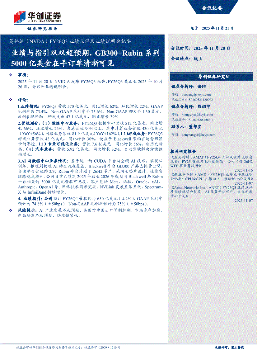 英伟达:华创证券-英伟达-NVDA.US-FY26Q3业绩点评及业绩说明会纪要:业绩与指引双双超预期,GB300+Rubin系列5000亿美金在手订单清晰可见-251121