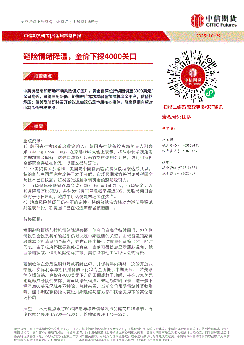 中信期货-贵金属策略日报:避险情绪降温,金价下探4000关口-251029