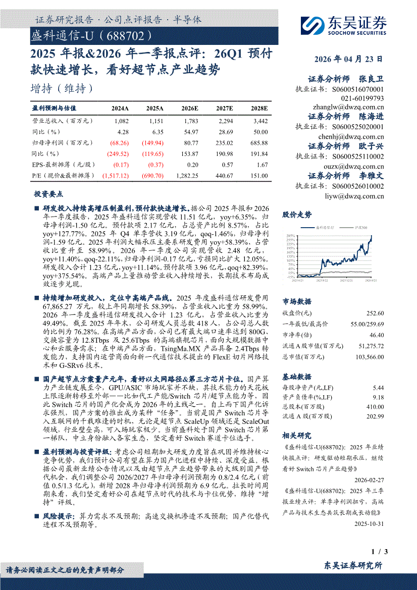 盛科通信:东吴证券-盛科通信-688702-2025年报&2026年一季报点评:26Q1预付款快速增长,看好超节点产业趋势-260423
