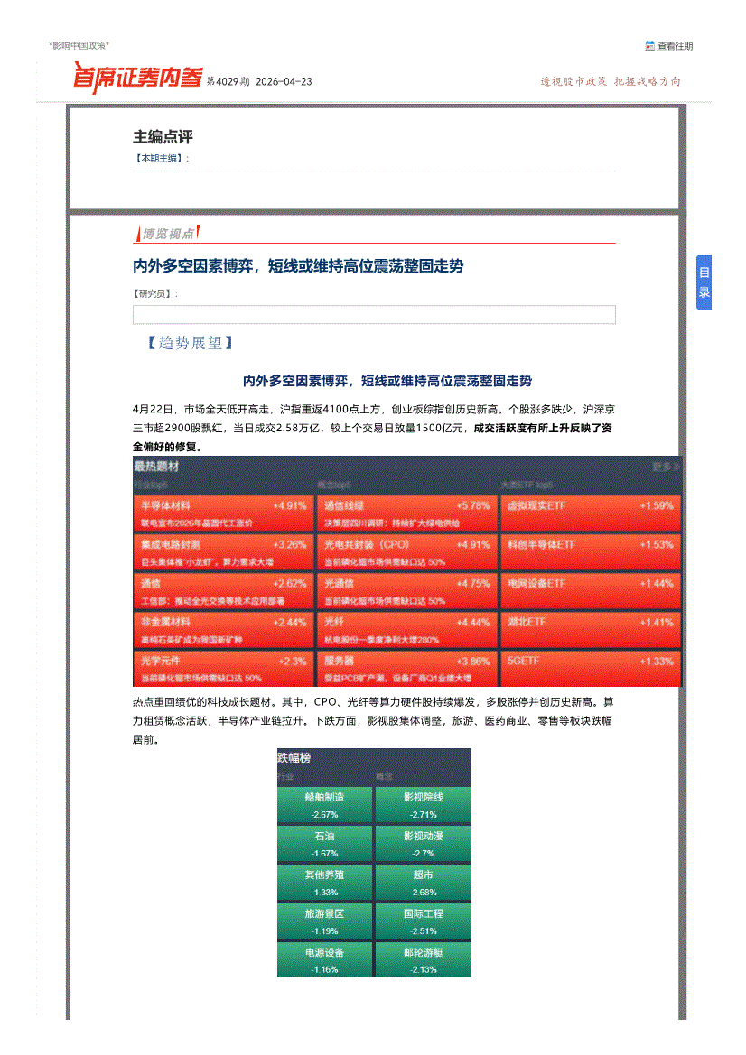 中原证券-市场分析:成长行业领涨,A股小幅上行-260422