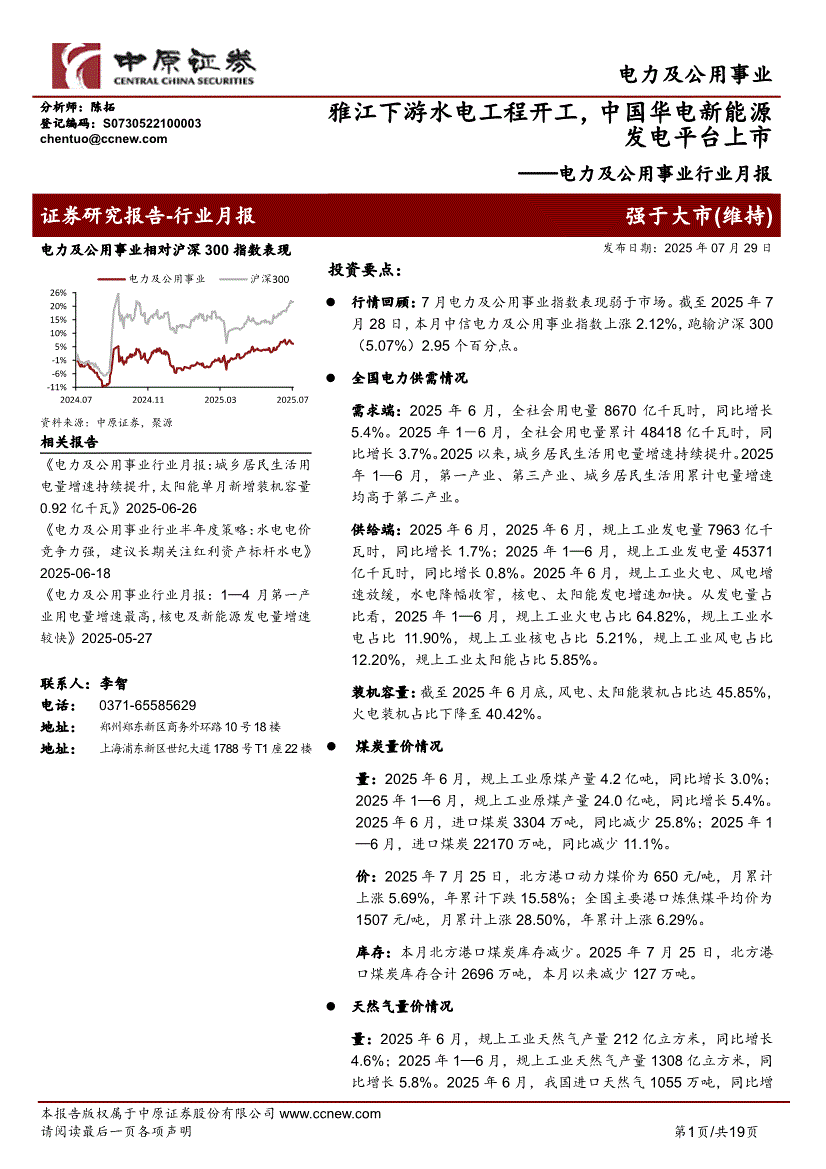 电力及公用事业行业:中原证券-电力及公用事业行业月报:雅江下游水电工程开工,中国华电新能源发电平台上市-250729