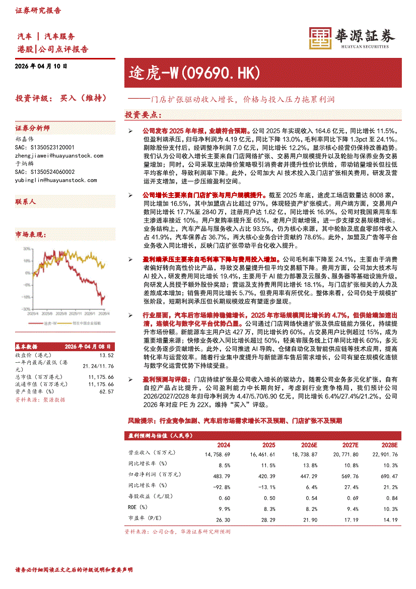 途虎~W:华源证券-途虎~W-9690.HK-门店扩张驱动收入增长,价格与投入压力拖累利润-260410