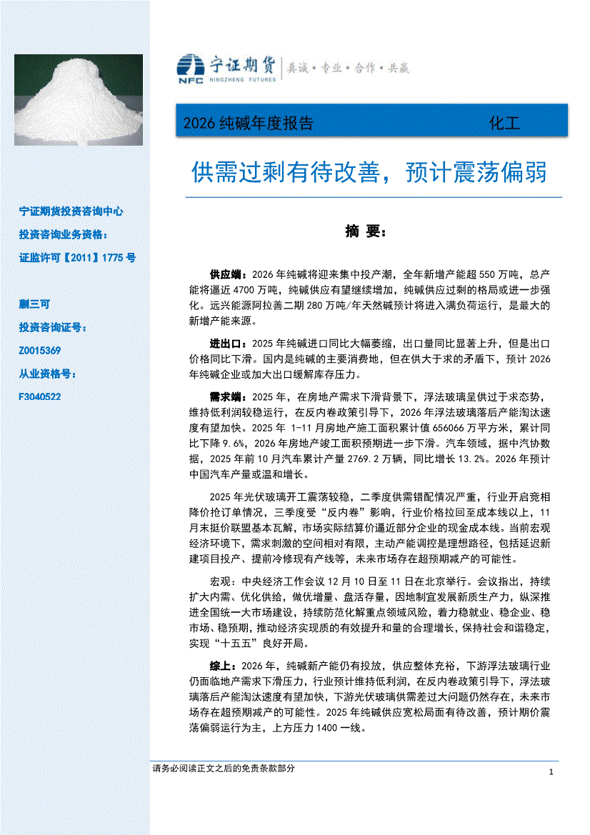 宁证期货-2026纯碱年度报告~化工:供需过剩有待改善,预计震荡偏弱-260107