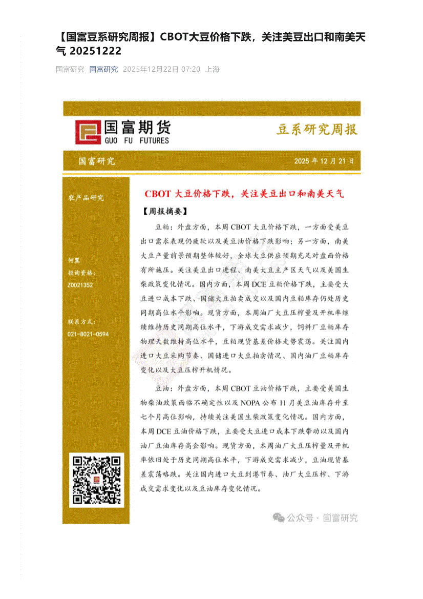 国富期货-豆系研究周报:CBOT大豆价格下跌,关注美豆出口和南美天气-251221