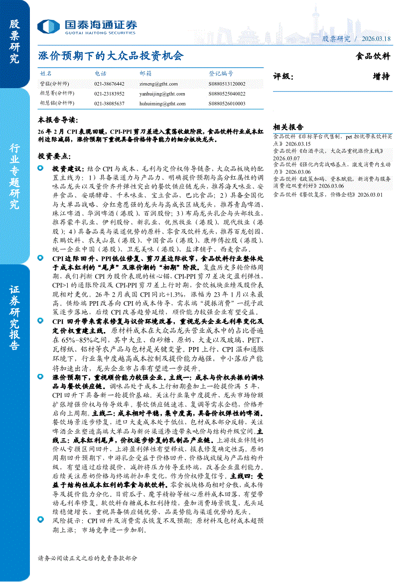 食品饮料行业:国泰海通证券-食品饮料行业:涨价预期下的大众品投资机会-260318