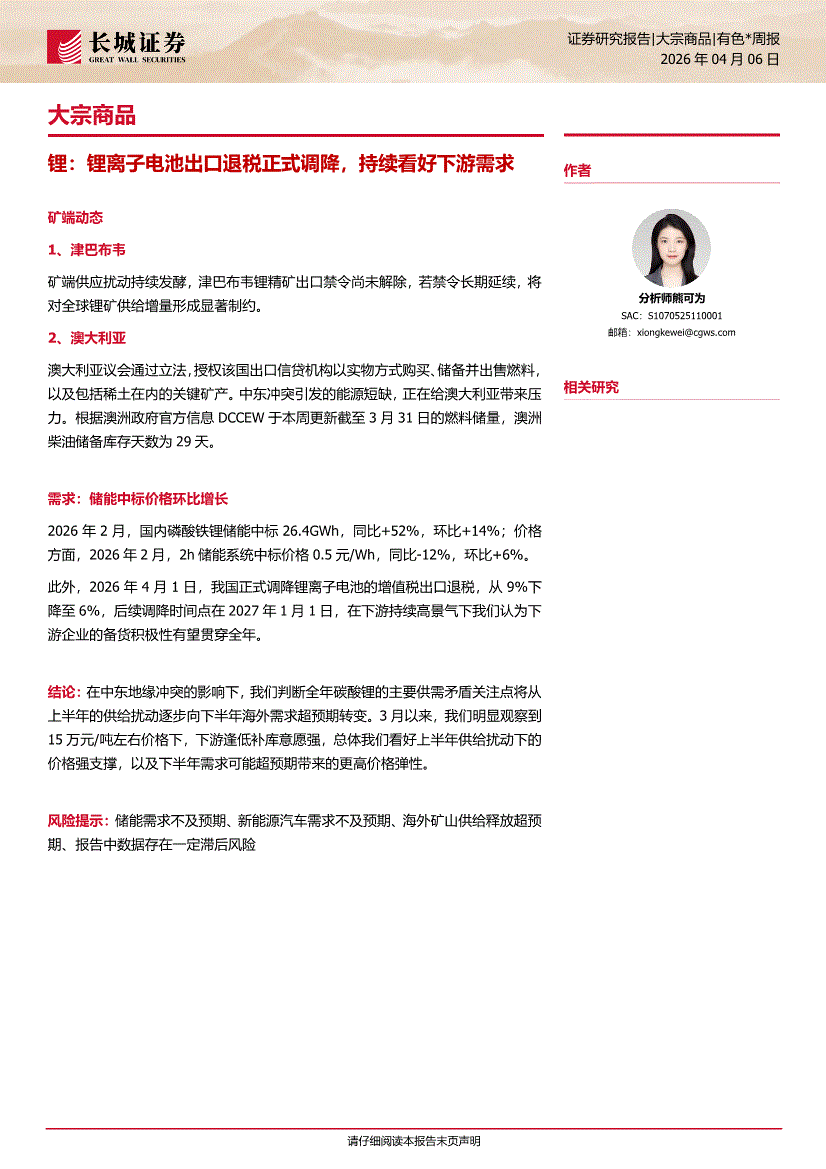 长城证券-大宗商品:锂,锂离子电池出口退税正式调降,持续看好下游需求-260406