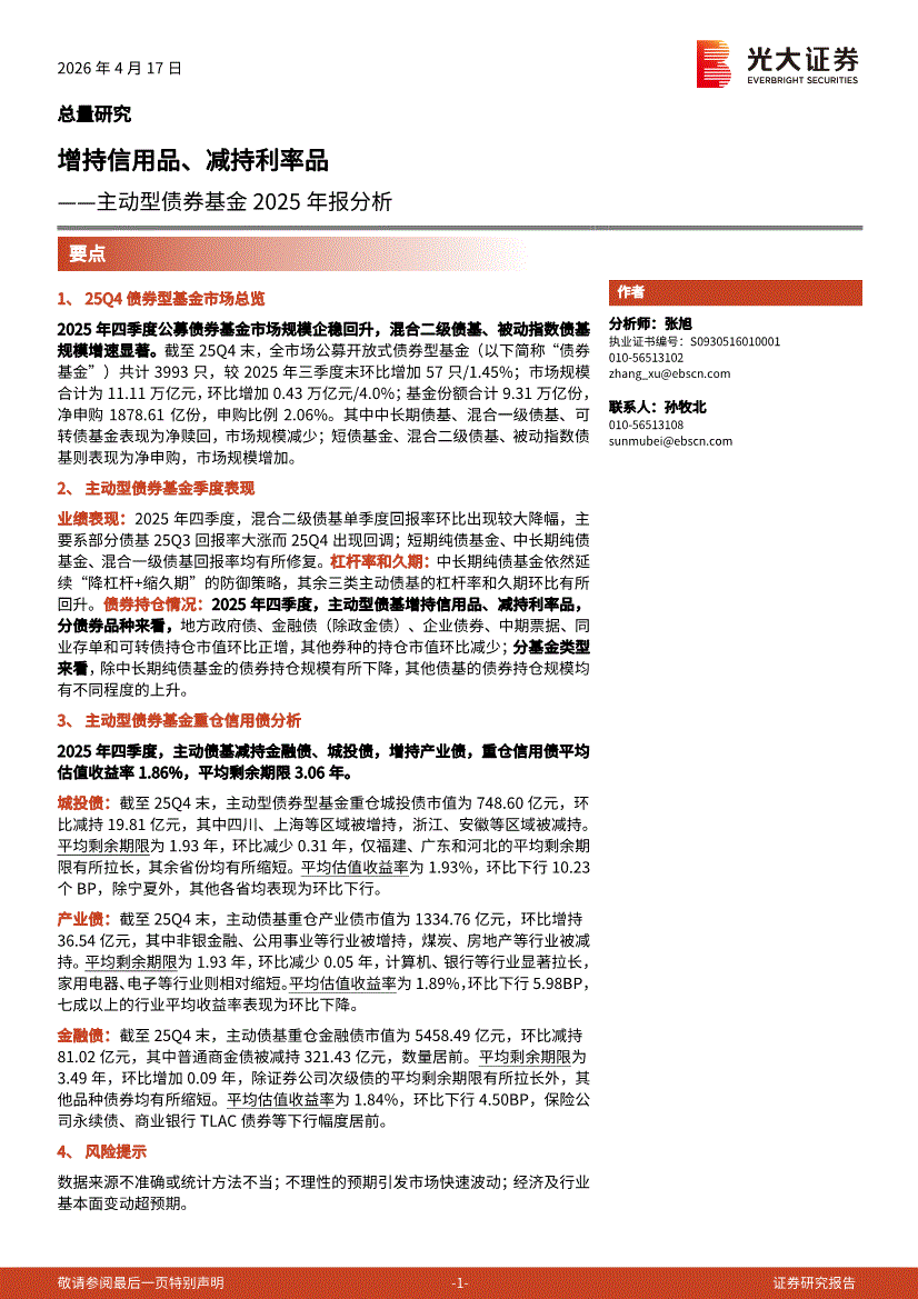 光大证券-主动型债券基金2025年报分析:增持信用品、减持利率品-260417