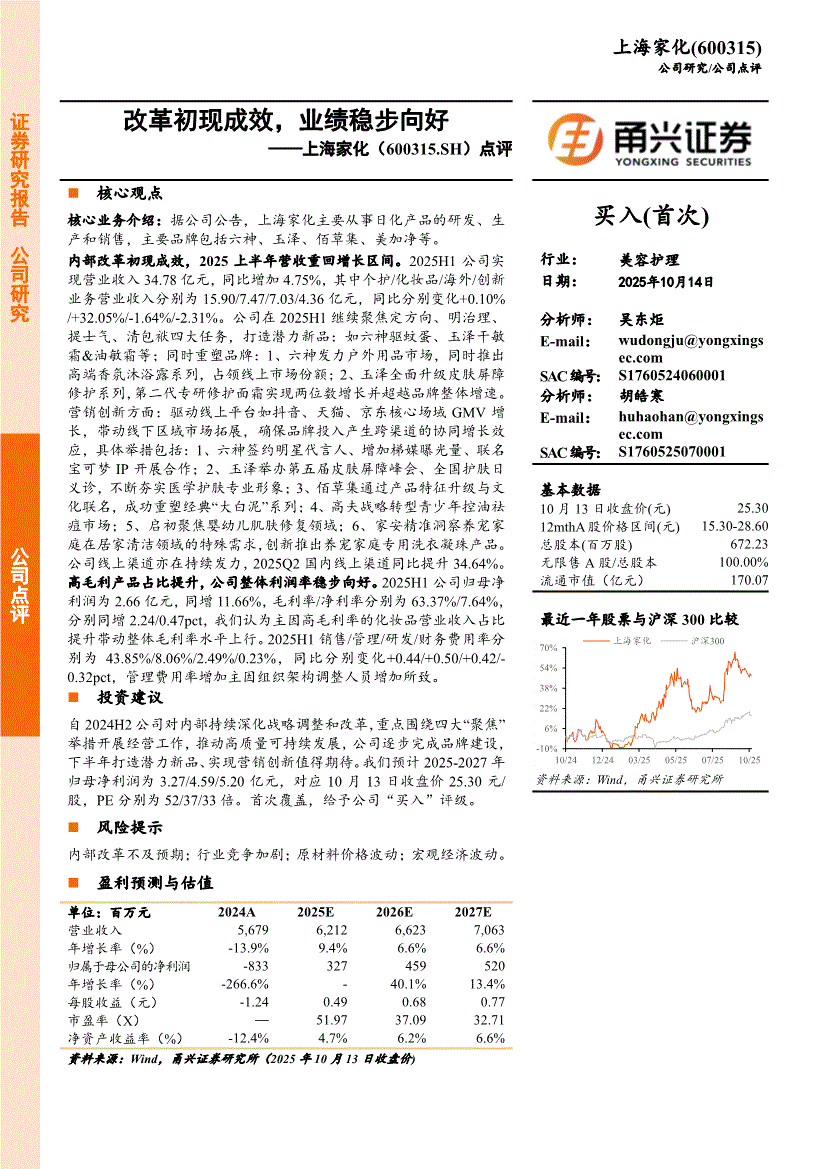 上海家化:甬兴证券-上海家化-600315-点评:改革初现成效,业绩稳步向好-251014