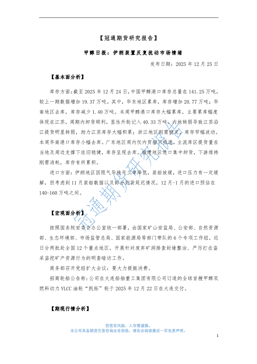 冠通期货-甲醇日报:伊朗装置反复扰动市场情绪-251225