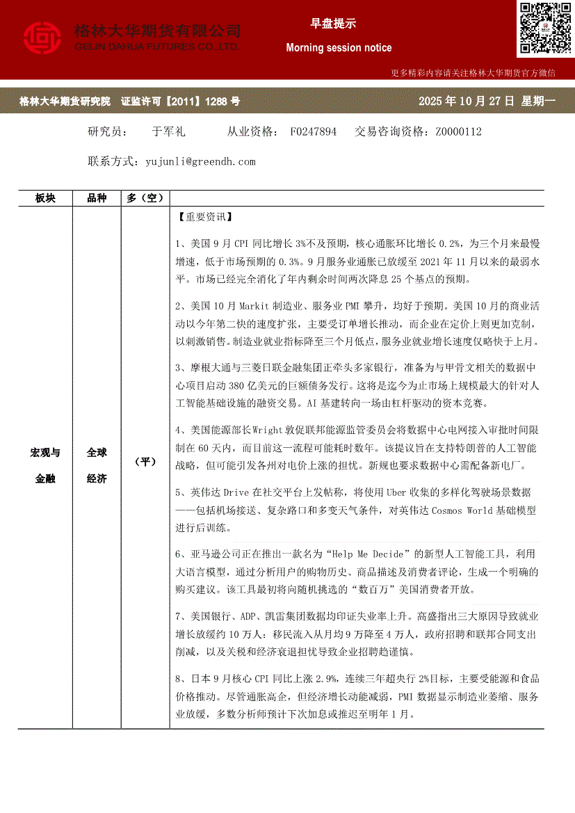 格林大华期货-早盘提示:全球经济-251027