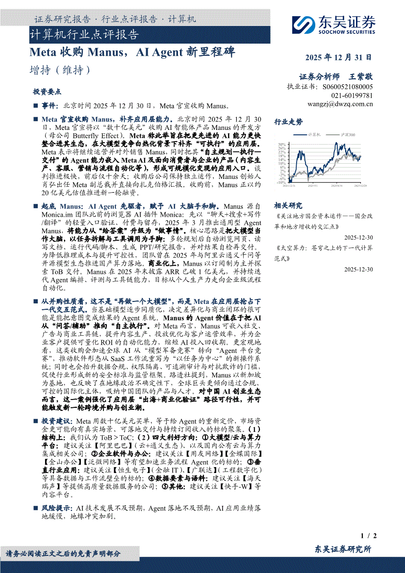 计算机行业:东吴证券-计算机行业点评报告:Meta收购Manus,AI Agent新里程碑-251231