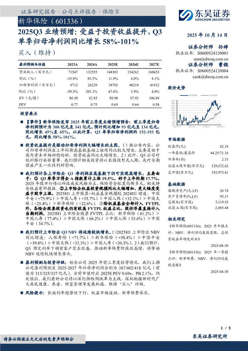 新华保险:东吴证券-新华保险-601336-2025Q3业绩预增:受益于投资收益提升,Q3单季归母净利润同比增长58%~101%-251014