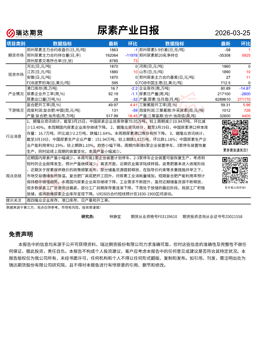 瑞达期货-尿素产业日报-260325