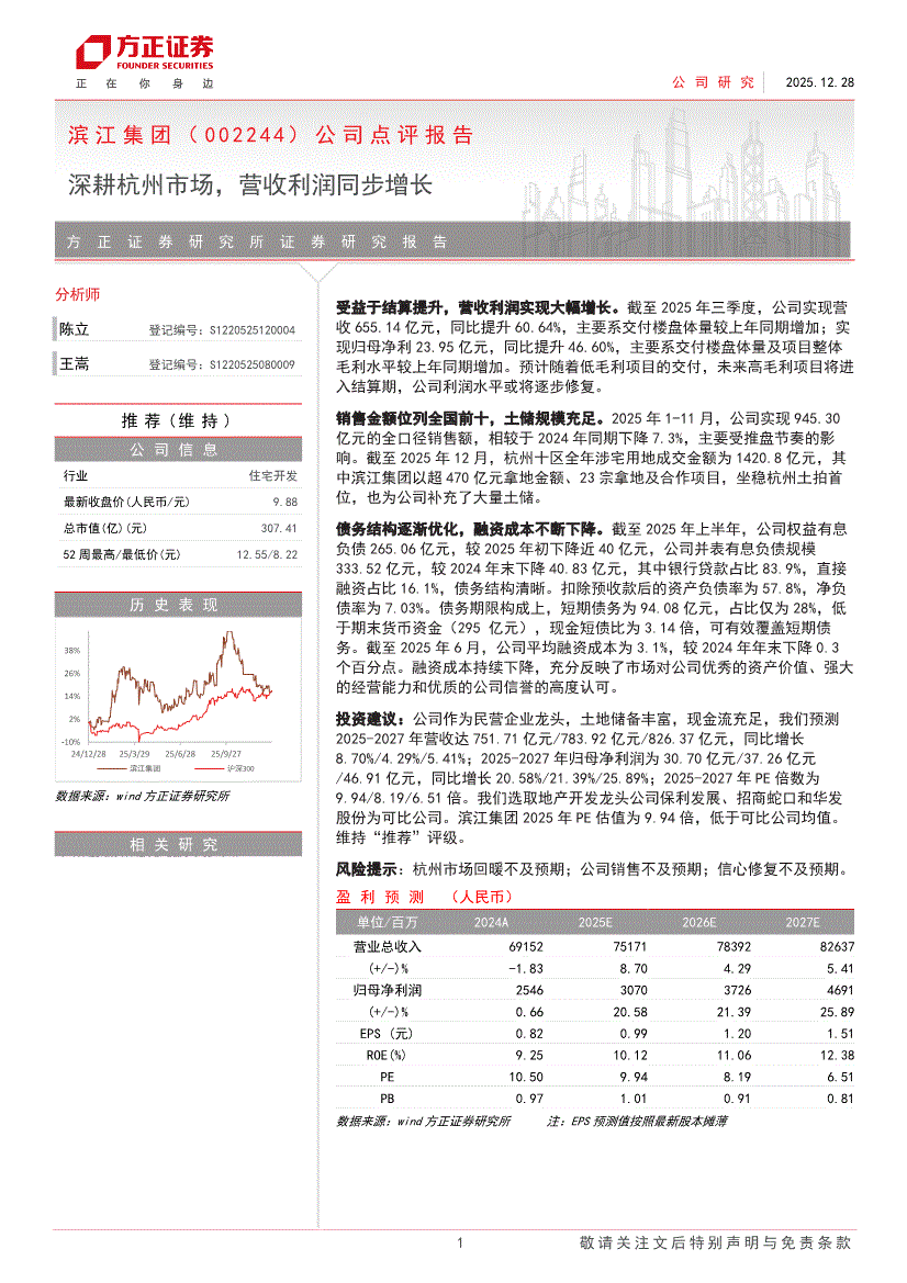 滨江集团:方正证券-滨江集团-002244-公司点评报告:深耕杭州市场,营收利润同步增长-251228