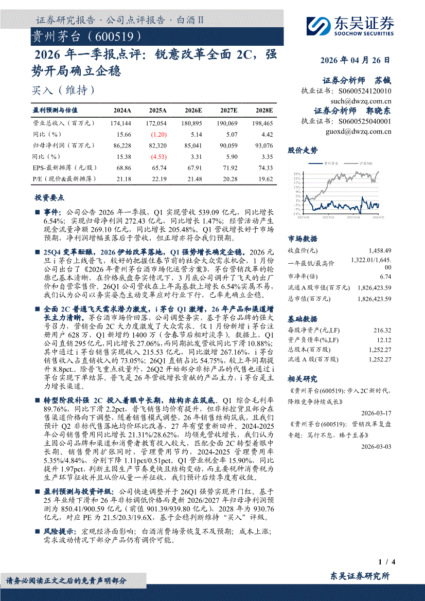 贵州茅台:东吴证券-贵州茅台-600519-2026年一季报点评:锐意改革全面2C,强势开局确立企稳-260426