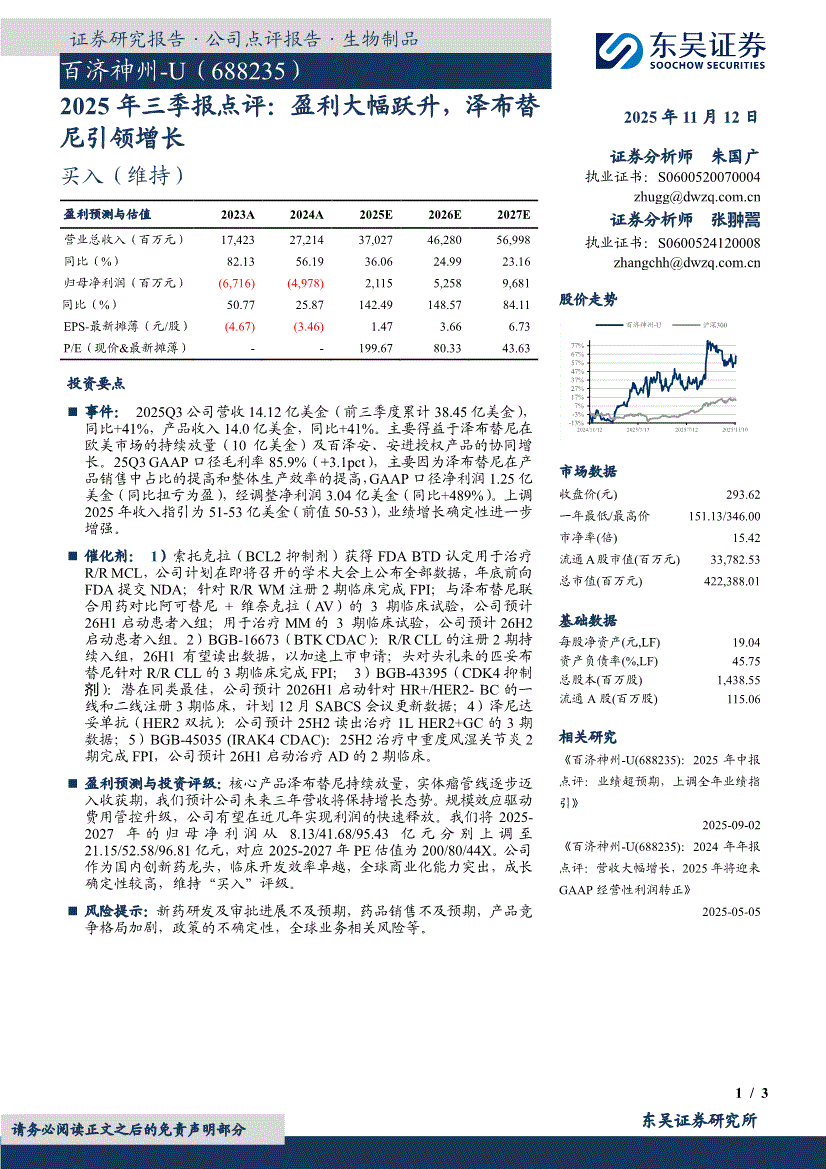 百济神州:东吴证券-百济神州-688235-2025年三季报点评:盈利大幅跃升,泽布替尼引领增长-251112