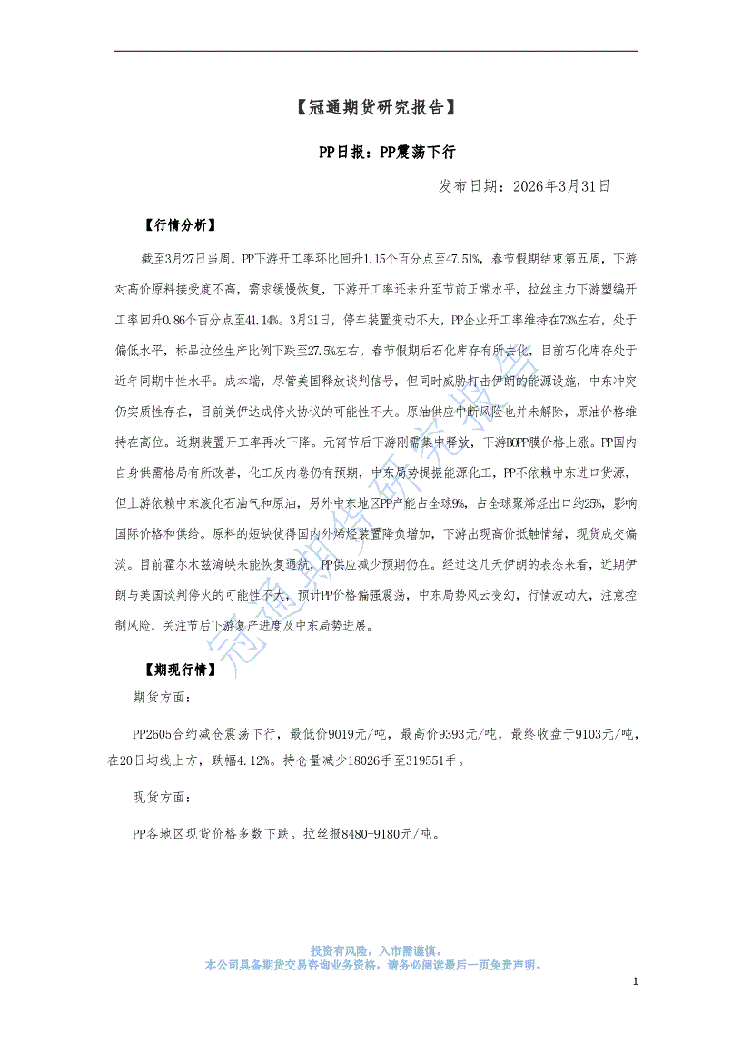 冠通期货-PP日报:PP震荡下行-260331